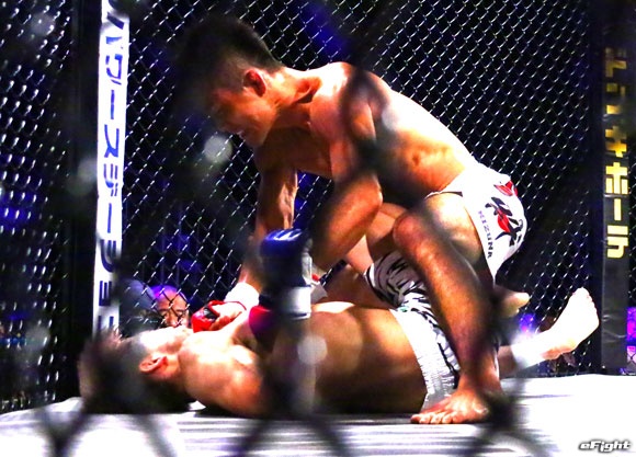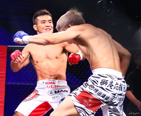 笑顔を浮かべながら打ち合うコンボイ(左)