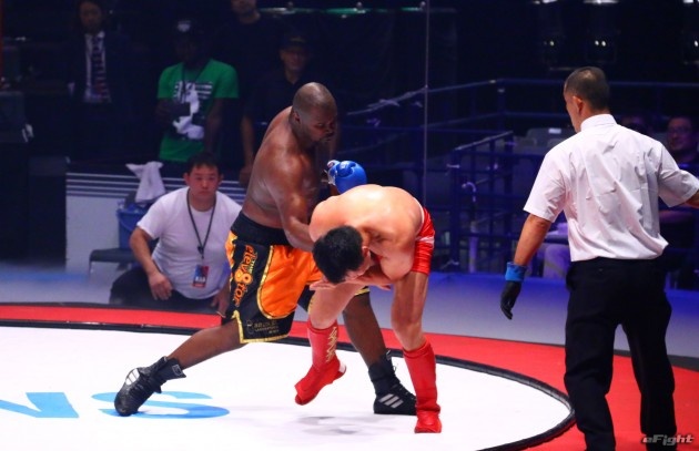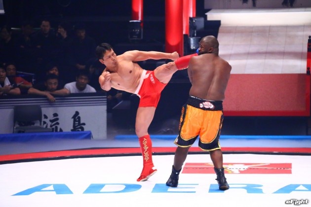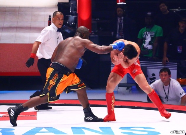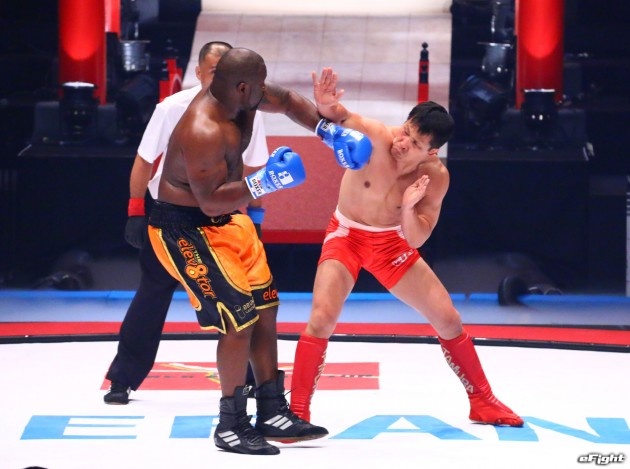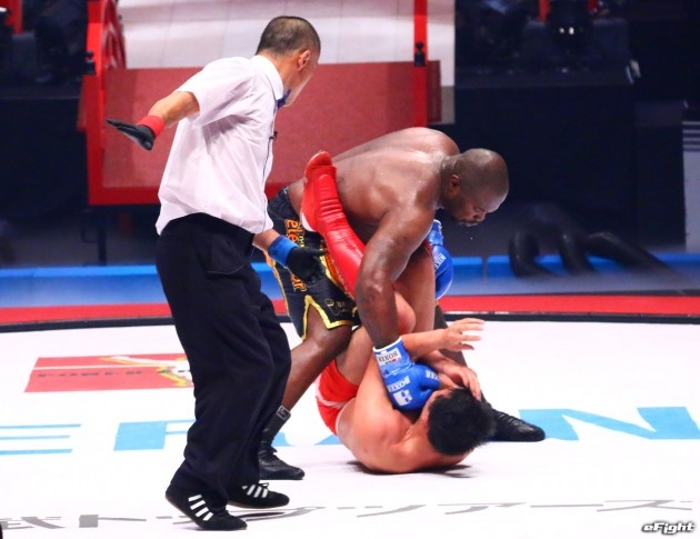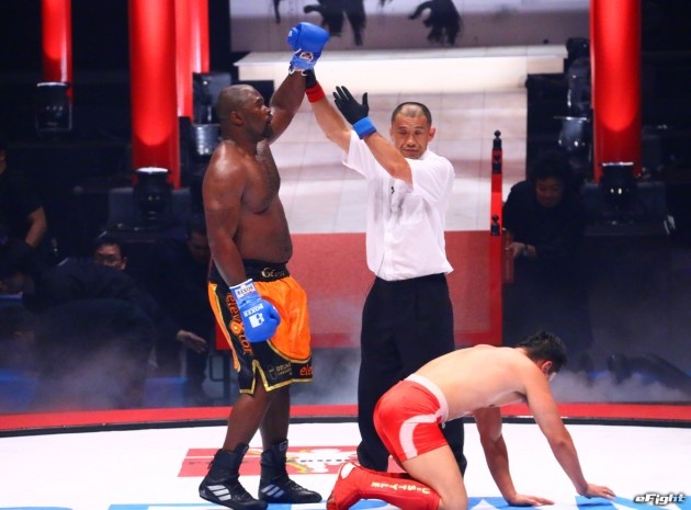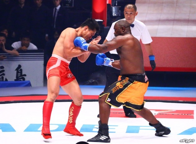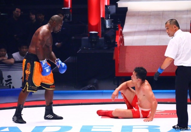 「アントニオ猪木vsモハメド・アリ」のルールをベースとした異種格闘技戦は、田村(下)が元ボクシング世界王者モヨ(上)にKO負けとなった