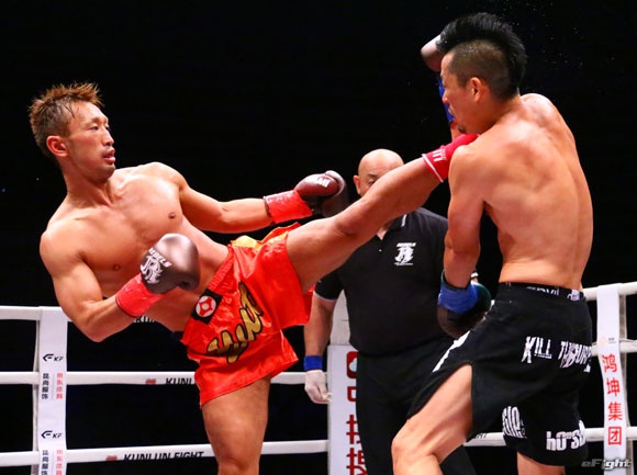 小磯(右)に左ハイを見舞う渡辺(左)
