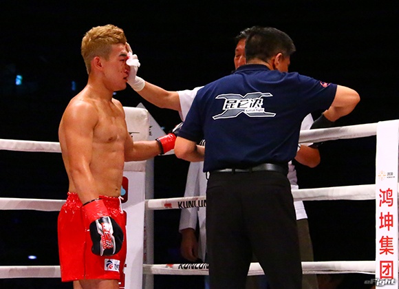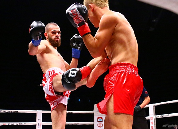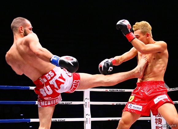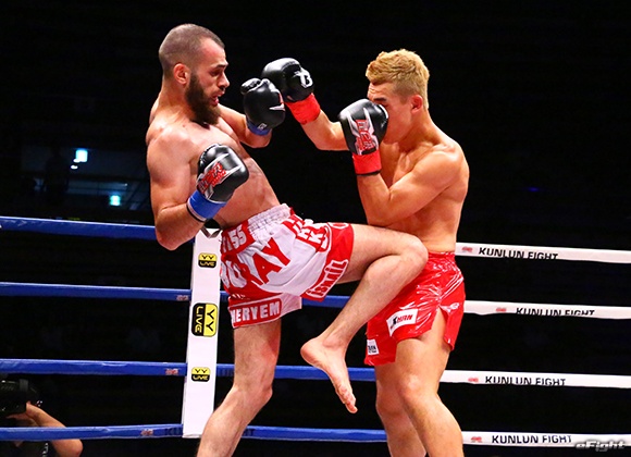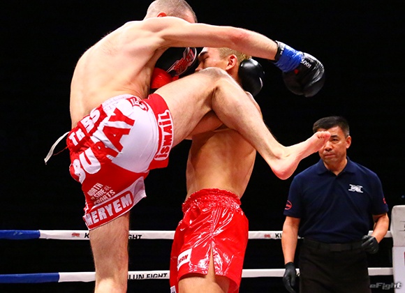 キム(右)のパンチに合わせてヒザ蹴りを放つボザリリマス(左)