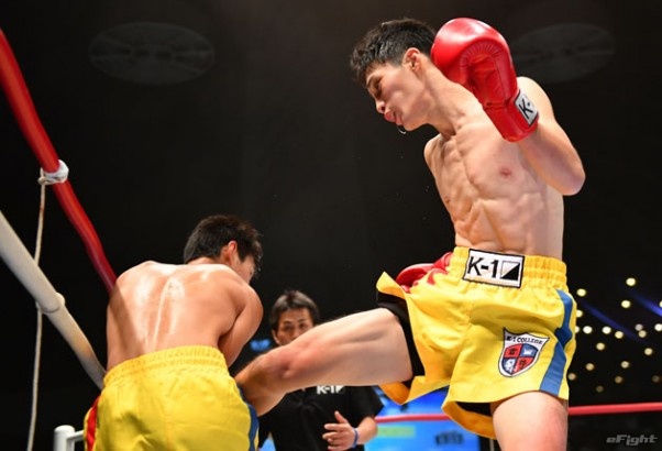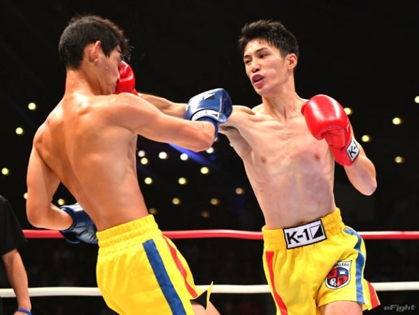 長いリーチからの右ストレートをヒットさせる森井(右)