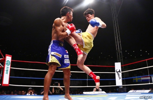 ボディへの飛びヒザ蹴り、左ボディブローでダメージを与えるチー(右)