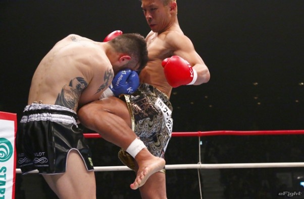 ボディへの飛びヒザ蹴りで小澤(右)が秒殺KO