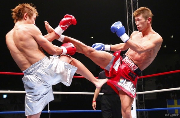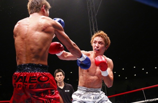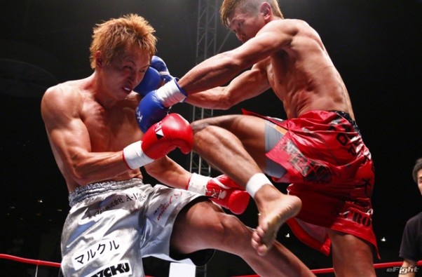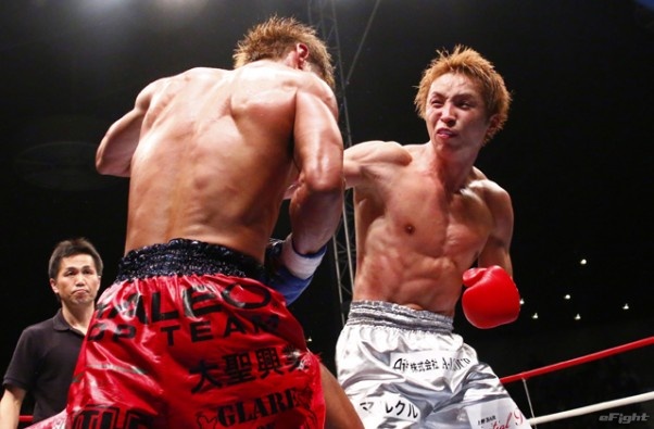 右フックをヒットさせる久保(右)