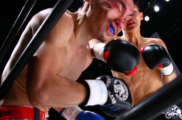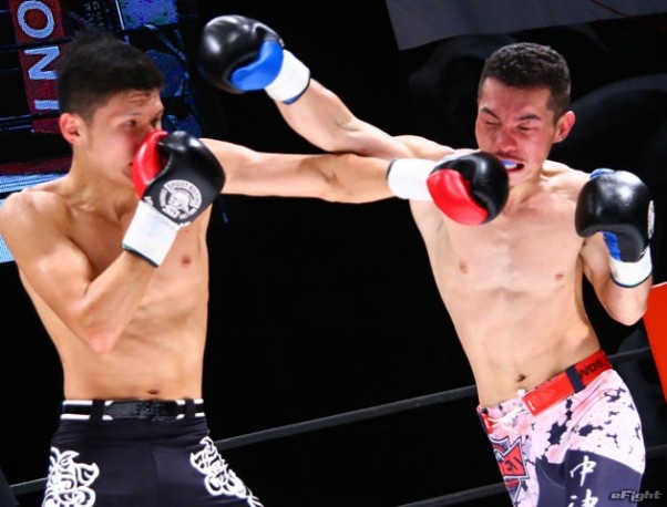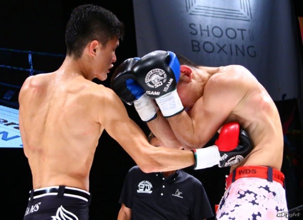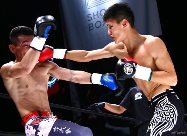 ワンツーで前に出る村田(右)が2度のダウンを奪って判定勝ちした