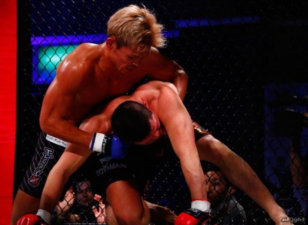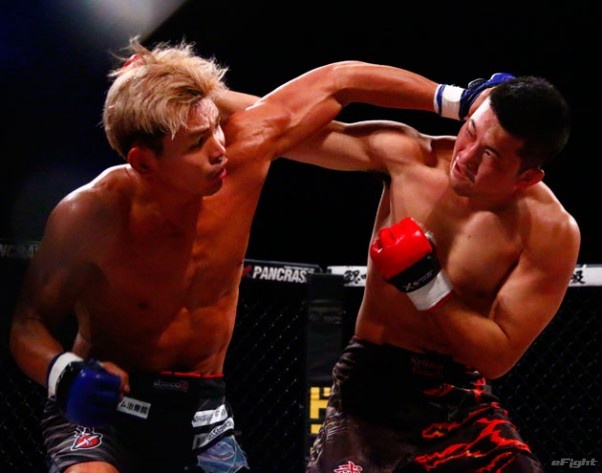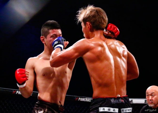 強打者対決はお互いに1Rから飛ばしすぎたか、両者ガス欠気味で阿部(左)が判定勝ち