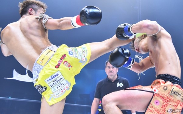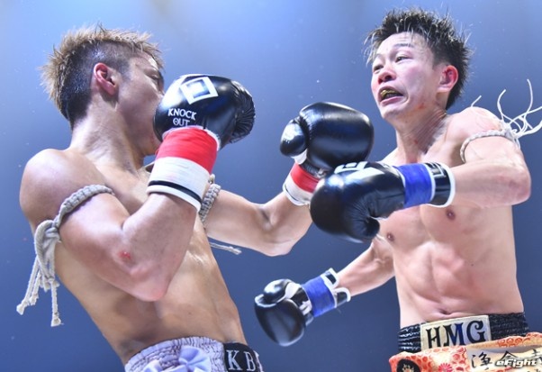 パンチ主体の攻めの矢島(左)をムエタイテクニックで翻弄する石井(右)