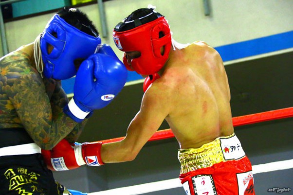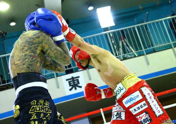 亀田(右)のボディ攻めに苦しみながらもユウタ(左)は必死の反撃を見せ、フルラウンド戦い抜いた
