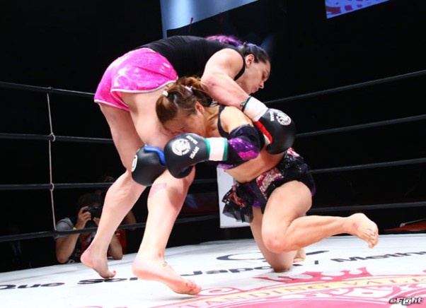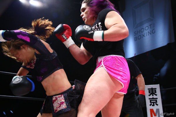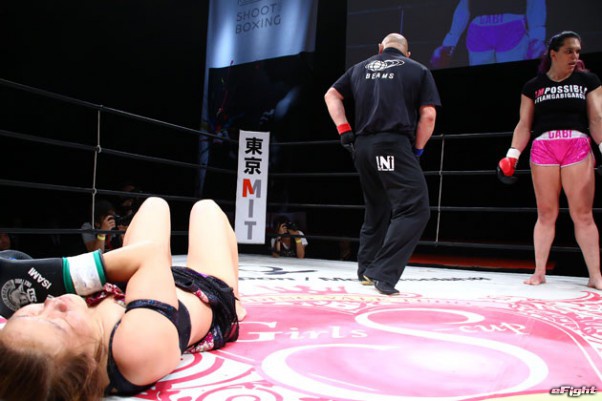 転倒した薮下に蹴りを見舞ってしまい、ギャビに減点1。そして無効試合に