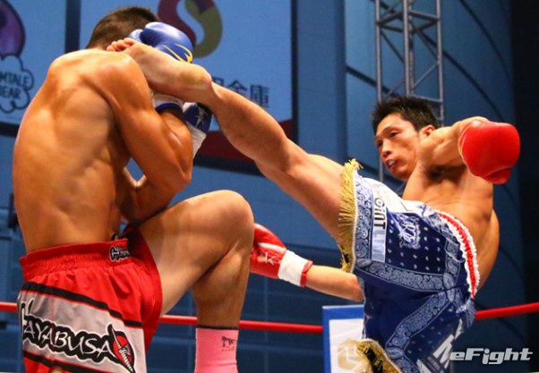左ハイを見舞う塚越(右)、ウェンハオ(左)を撃破した