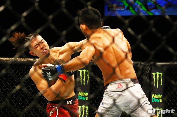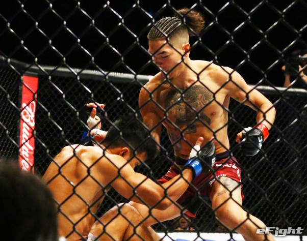 1Rから左フックでダウンを奪った石原(左)