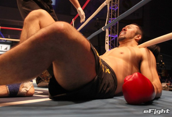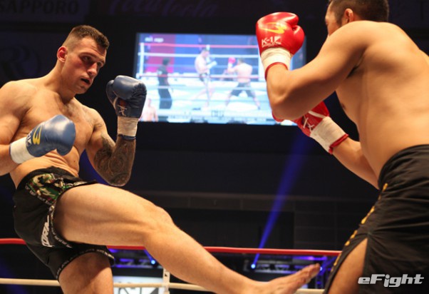 飛びヒザの二段蹴りで上原(右)をKOしたプラチバット(左)