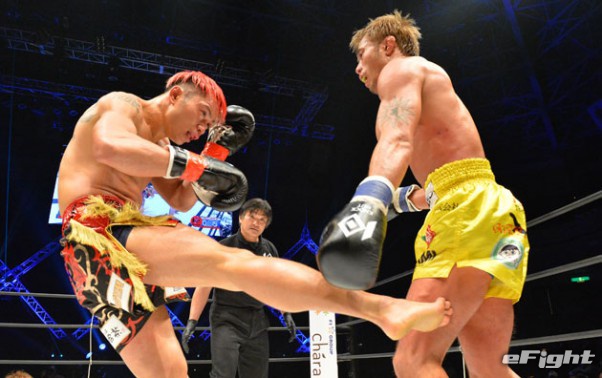 不可思(左)の執拗なローキック攻撃にダメージを負いながらも最後まで経ち続けた金原(右)