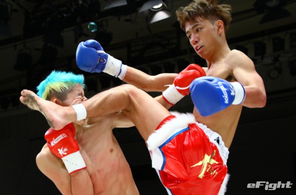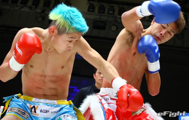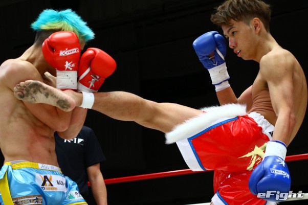 森坂(左)に二段蹴りを見舞う亀本(右)