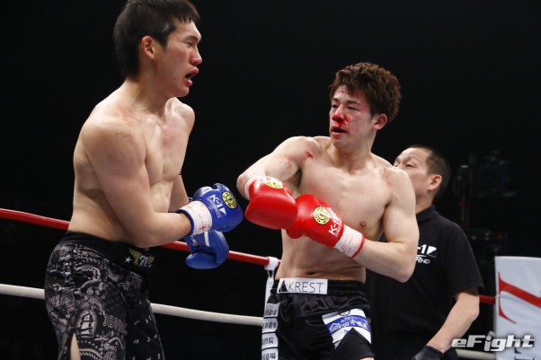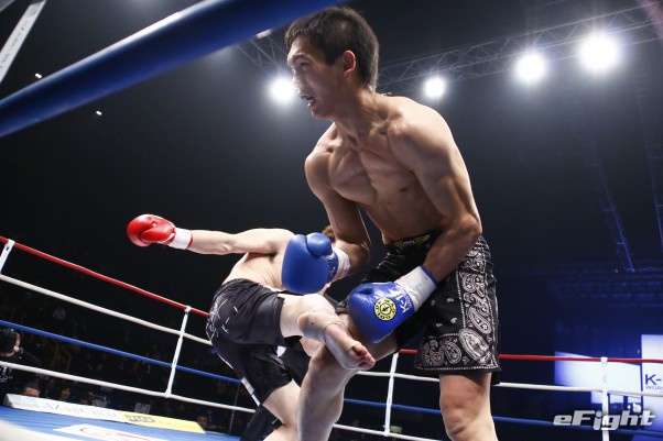 右ローと右ストレートで3ノックダウンを奪いKO勝利した佐野(右)