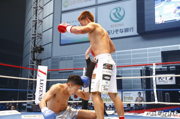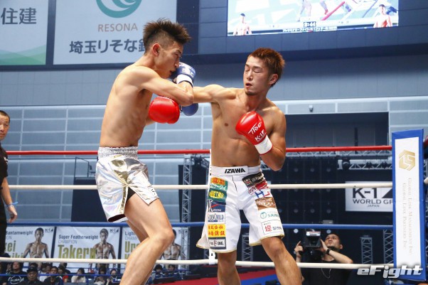 英雄伝説世界王者の伊澤波人(右)が右フックでダウンを奪う
