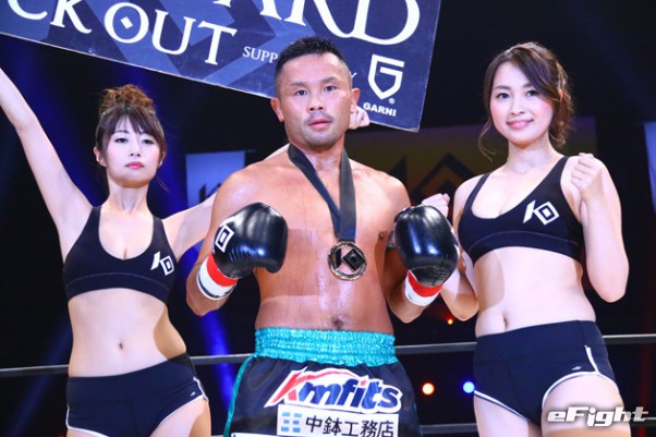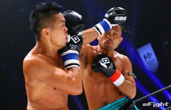 緑川(右)のヒジ打ちが宍戸(左)にヒット