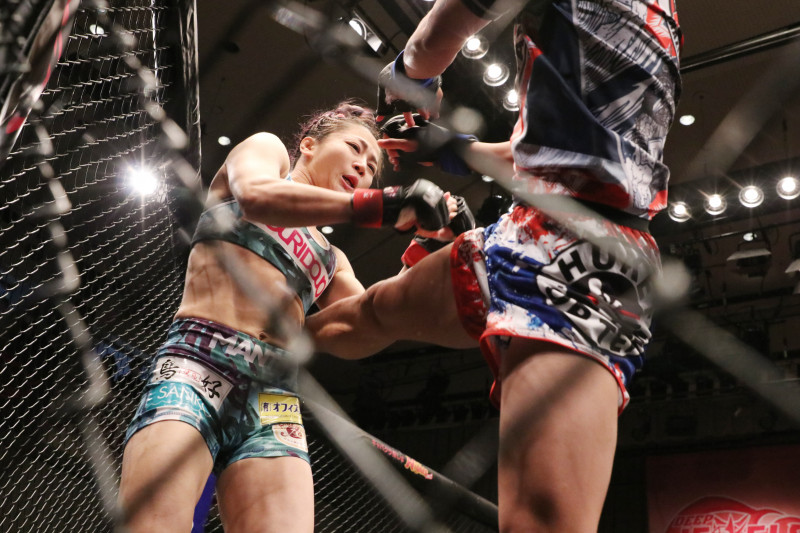 アムの強烈な右ミドルキックが佐藤の脇腹を捉える