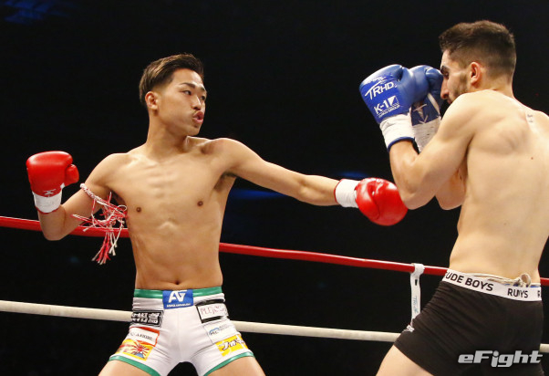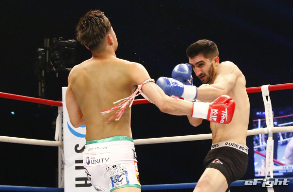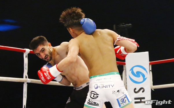 ダウンを奪われた芦澤はパンチで積極的に攻める