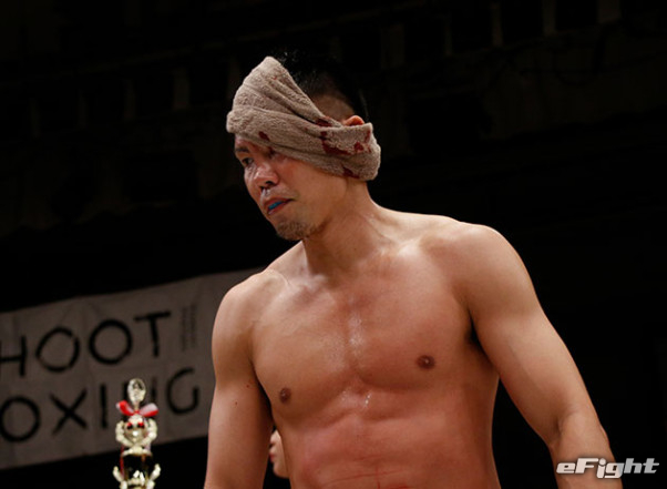 宍戸のヒジで額をカットされ、タオルを巻いた喜入