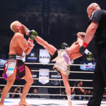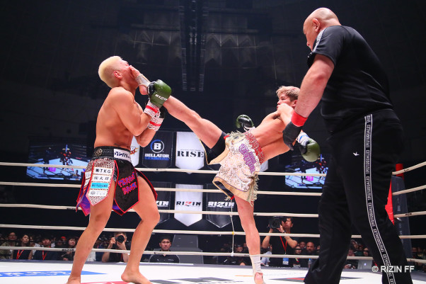 伸びのあるハイキックを蹴り込む白鳥