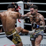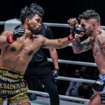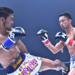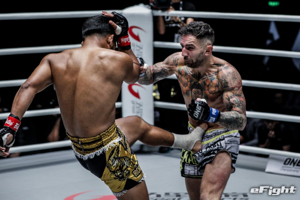 ロートレックはハリソンのパンチに前蹴りを合わせ威力を半減させる