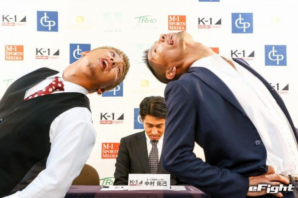 5月の会見で、メンチを切り合う堀井(右)と瑠久