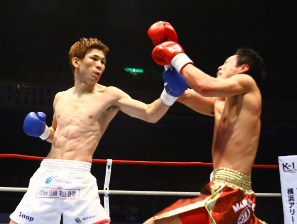 レオナ(左)の左ストレートがヒット、小宮山が崩れ落ちる