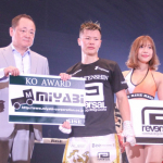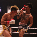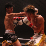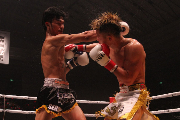 スアキムの狙いすましたストレートを紙一重で避ける那須川(右)