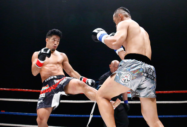 鋭い左ローを徐々に効かせていくT-98(左)