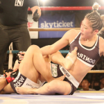 中腰の体勢で赤林檎(左)を絞め上げる杉山(右)