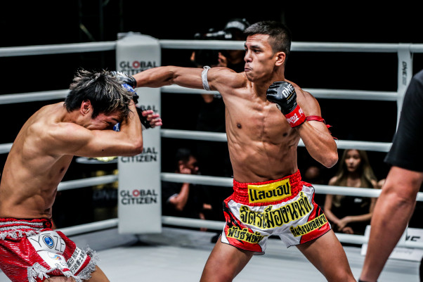 前進する工藤をパンパヤック(右)は鋭い右ジャブで突き放す