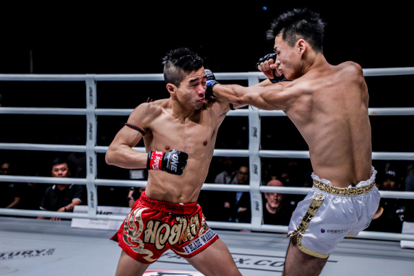 ニューイェン(左)のパンチをさばけずにペースを握られる小笠原