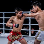 小笠原(右)は長身から繰り出すミドル・ローで距離を取りたいがニューイェンの前進を止められない