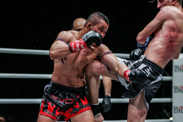 右ミドルを被弾したデルバール(右)の脇腹は赤く染まっていた