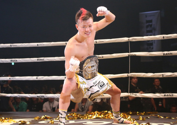 ベルトを巻いた那須川、おなじみの“トリケラトプス拳”のポーズを披露