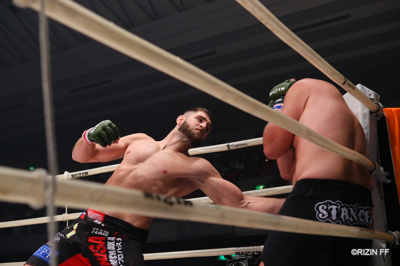 ガードを固め後退するマルドナドをプロハースカは上下に打ち分けパンチで攻める