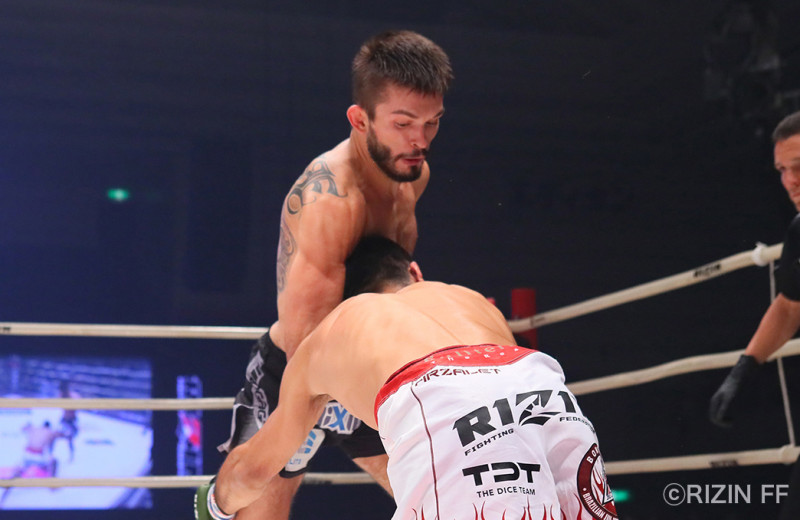 サトシがタックルのタイミングでケースが右アッパー!目に直撃したようだ。