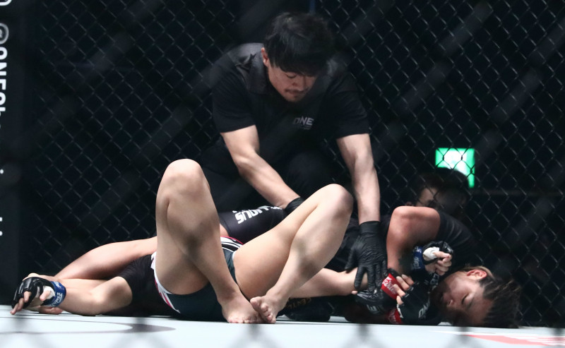 平田がイシゲの両足で首を絞めつけたまま左腕を伸ばし一本勝ちを奪取