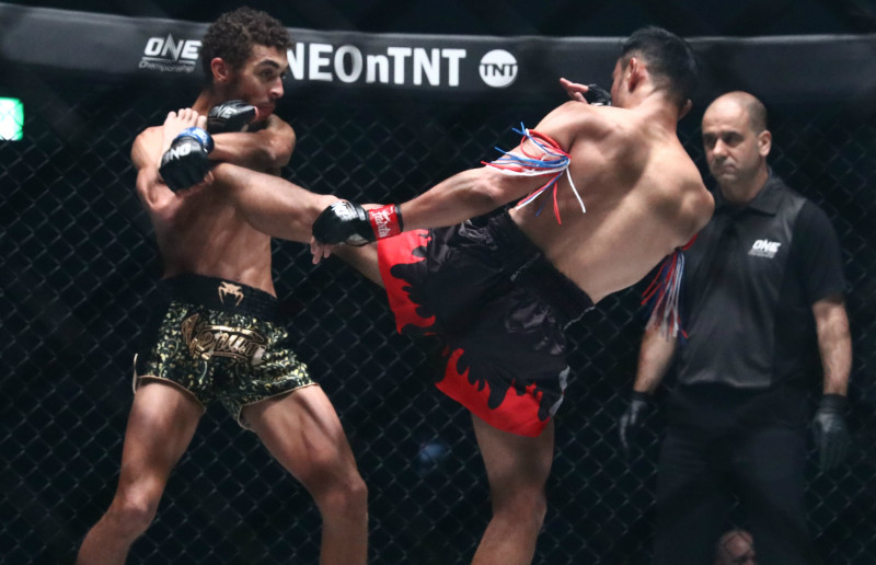 サムエー(右)の代名詞ともいえる左ミドルでローランは何度もバランスを崩した