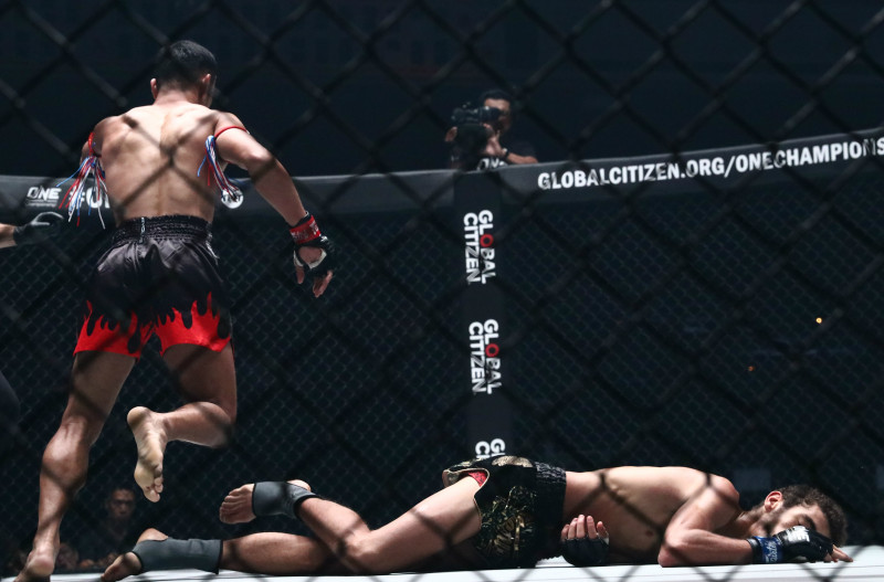サムエー(左)の左ショートフック一撃でローランは戦闘不能に