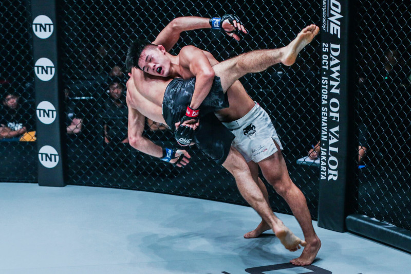 リーはアサラナリエフを持ち上げテイクダウンを奪うパワーを見せる