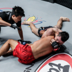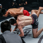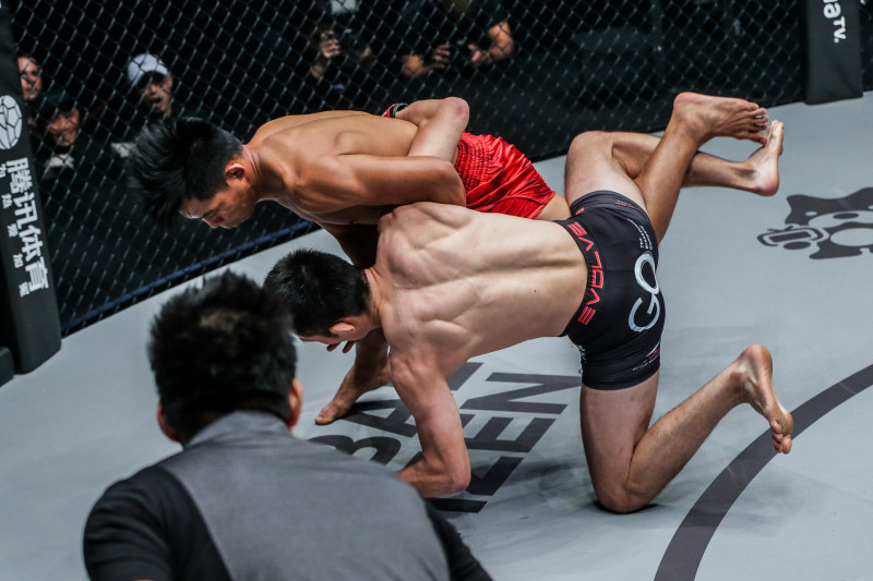 電光石火のタックルで右手をバナリオの脇に刺した青木はそのままフィニッシュにつながるテイクダウン