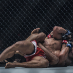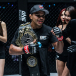 防衛成功したビビアーノがベルトを肩にかけてガッツポーズ Photo by ONE Championship