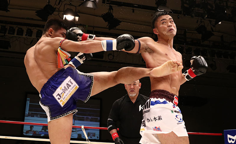 日菜太のバックハンドブローにラーシーシンが右ミドルを合わせる
