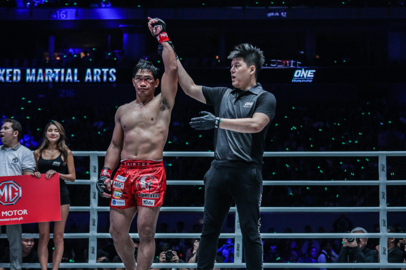 顔面から出血しつつも勝ち名乗りを受けたフォラヤン