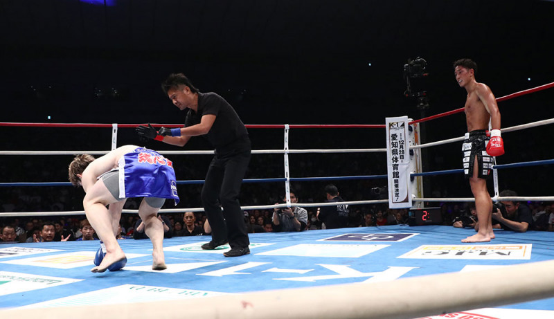 ダウンから立ち上がろうとする金子(左)