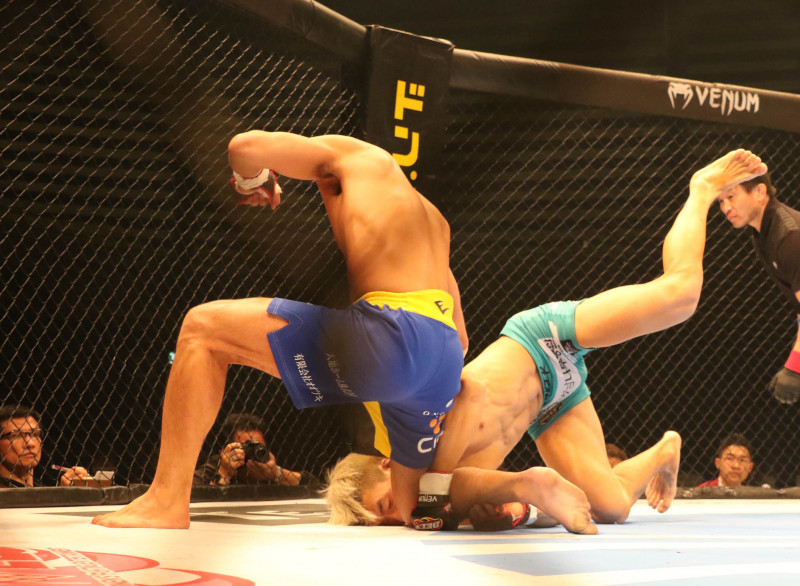 岸本篤史(左)が左フックからのパウンドで秒殺TKO勝利