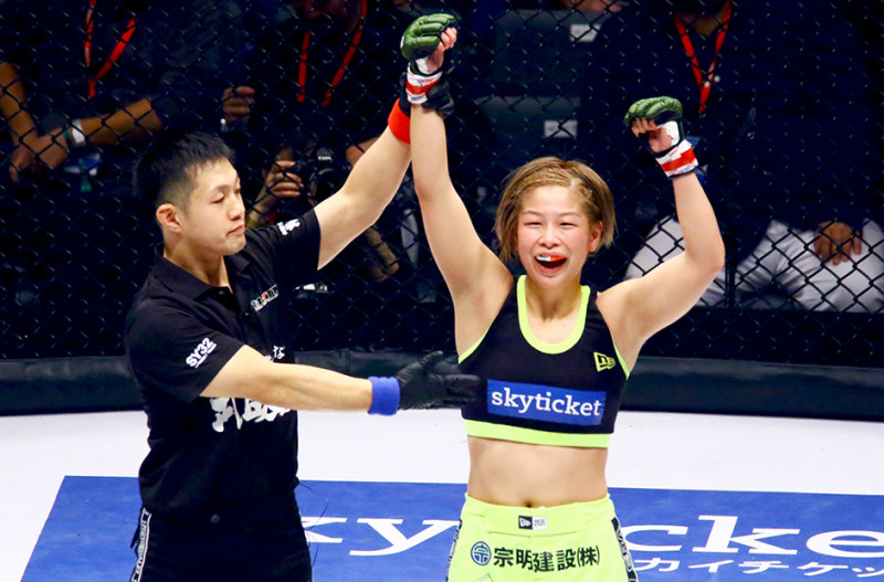 笑顔で勝ち名乗りを受けた