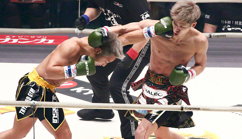 互角の展開の白鳥・大雅の再戦だったが、白鳥のヒザ蹴りで大雅を切り裂きTKO勝利